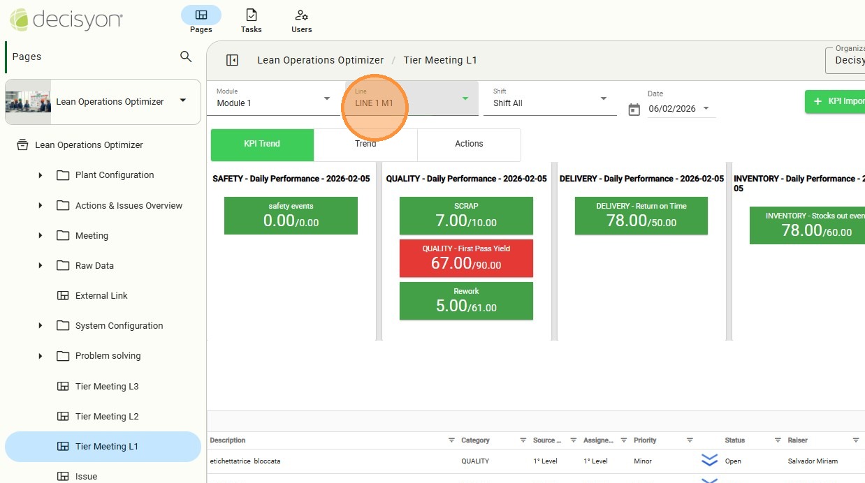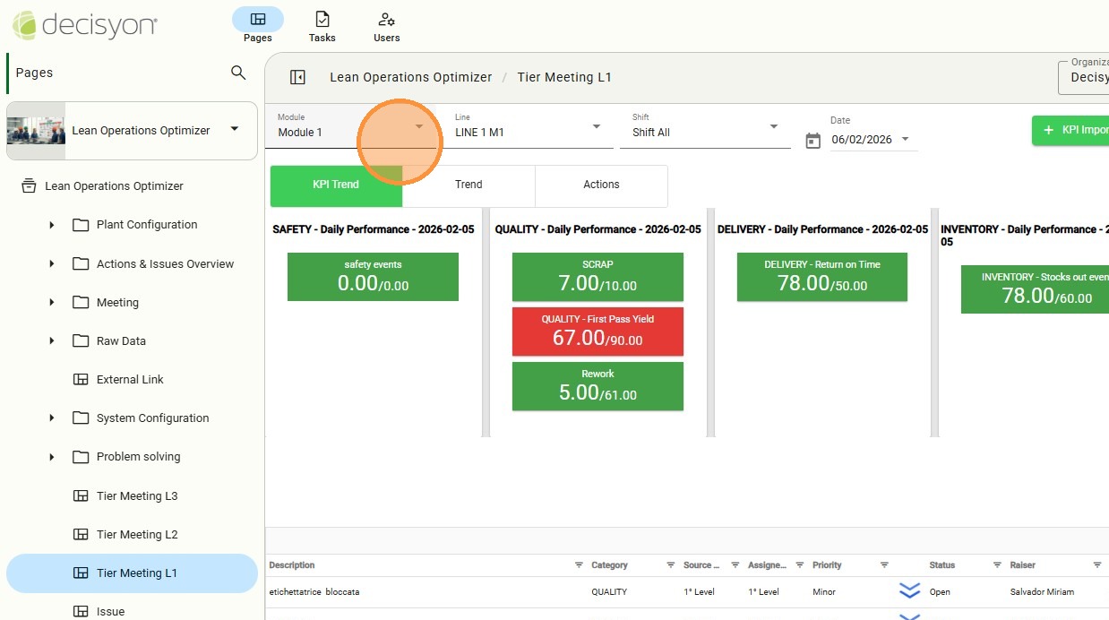 The Tier L1 module is designed to facilitate daily management meetings at the production line and shift level. It serves as the primary touchpoint for operators and supervisors to monitor performance and address immediate operational issues.