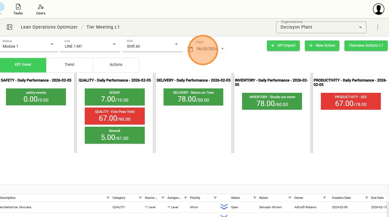 The system centralizes Key Performance Indicators (KPIs) grouped into configurable categories such as Safety, Quality, Delivery, Inventory, and Productivity. Data is populated through automated system integration (MES/ERP), manual entry, or bulk Excel imports. Beyond data visualization, the module enables real-time task management, allowing teams to create, modify, and escalate actions directly during the meeting to ensure continuous improvement and accountability across organizational levels.
