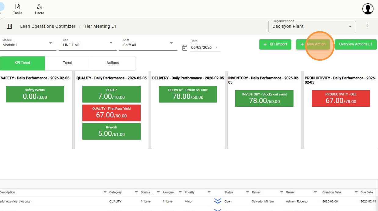 Once the new action is created, it will be displayed both in the report at the bottom of the page and in the "Actions Overview L1" section, provided that the assigned level remains unchanged. If the level is modified during creation, the action will only be visible within the dashboard of the corresponding Tier.