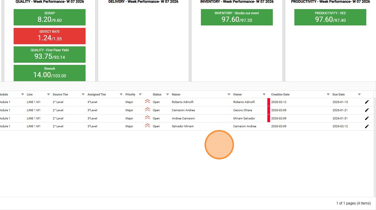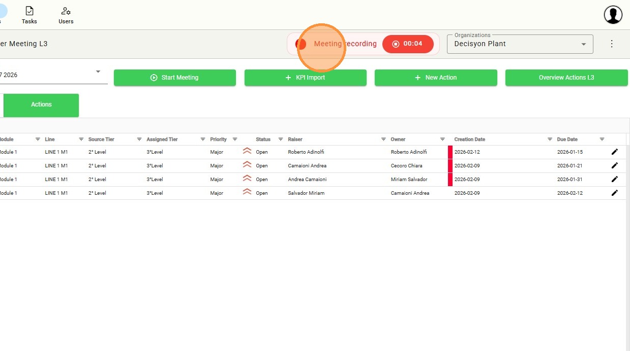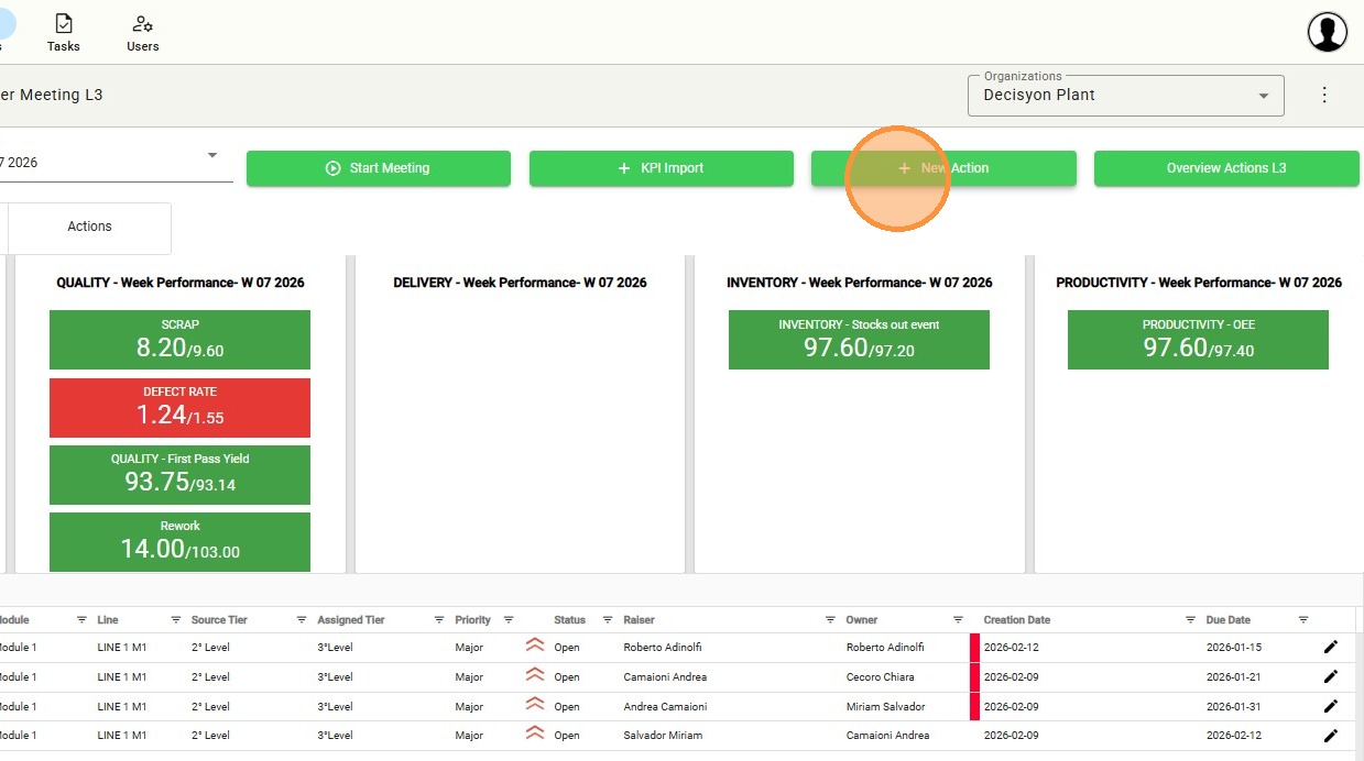 The lower section of the Tier L3 dashboard displays a real-time overview of open actions for the day and facilitates the direct creation of new tasks during the meeting, ensuring that all priorities identified during the discussion are immediately recorded.