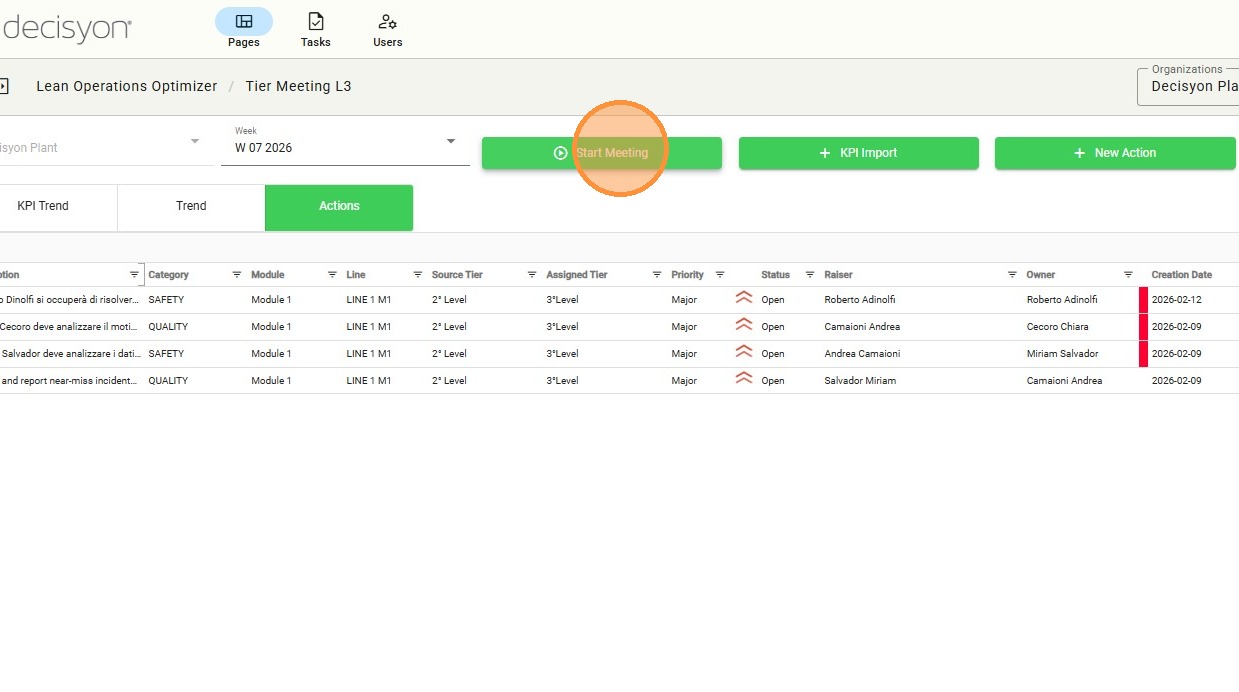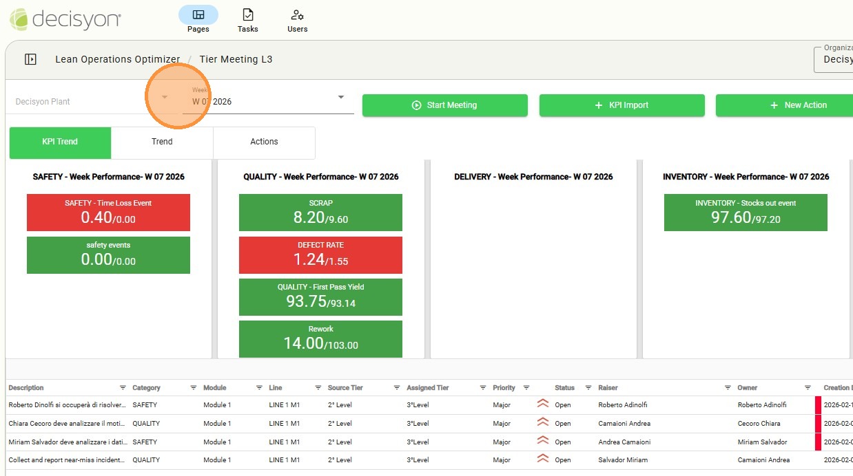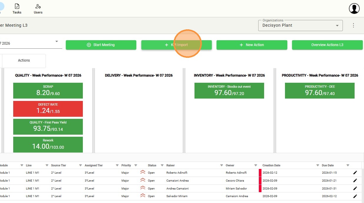 The main header displays the current plant name and the reference week (e.g., W 07 2026), providing an immediate overview of the analysis timeframe. This section serves as a quick-access control hub, allowing users to manage meeting sessions, import KPI data, and handle operational actions directly.