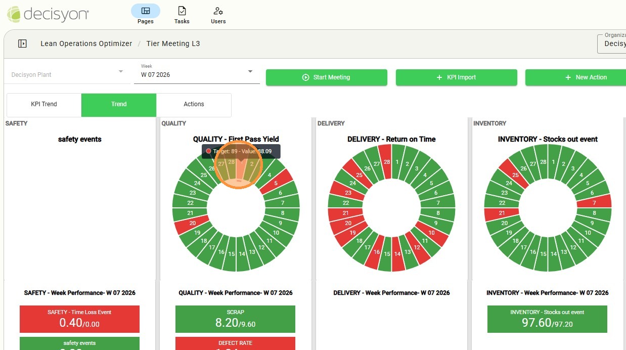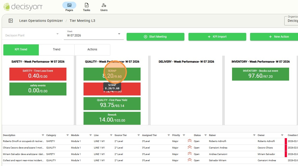 The Tier 3 board is designed for plant-level management, aggregating operational data by facility (plant) and week. The module provides a centralized view: