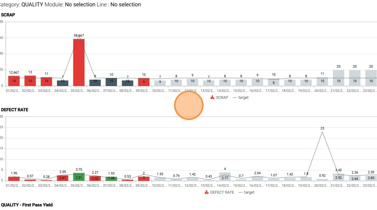 The target review functionality enables the verification of established reference thresholds, such as quality scrap limits or defect rate goals, ensuring an immediate comparison between actual performance and predefined standards.