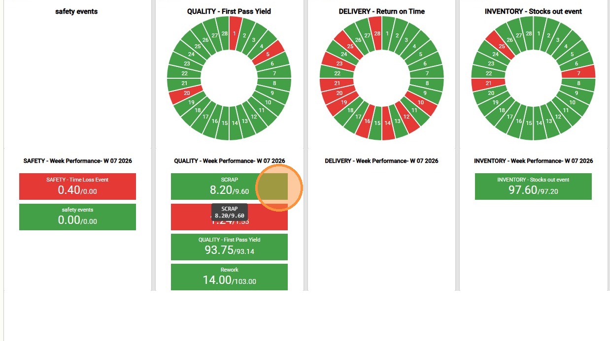 After selecting the context parameters, the dashboard automatically updates the performance metrics displayed on the page. The system organizes data into primary categories, such as Safety, Quality, Delivery, and Inventory.