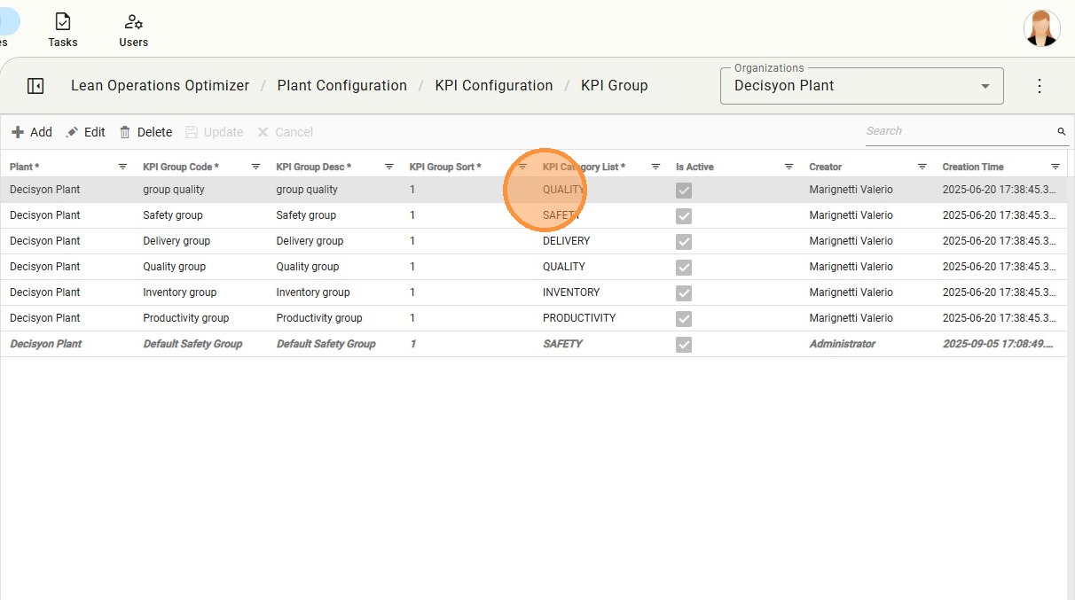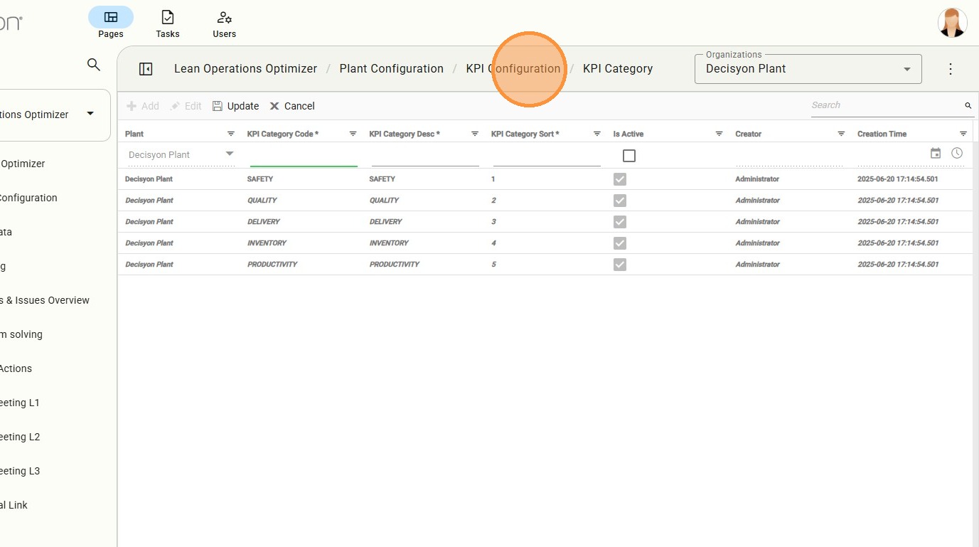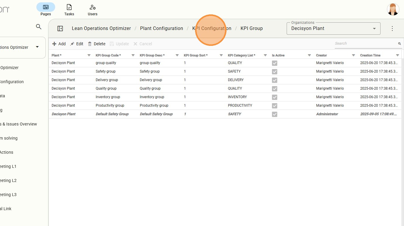 The KPI List view provides a comprehensive table of all active indicators. From here, users can manage the specific metadata for every metric tracked in the plant.
