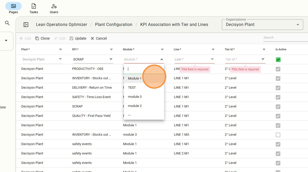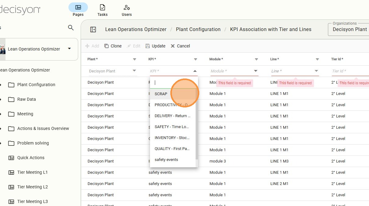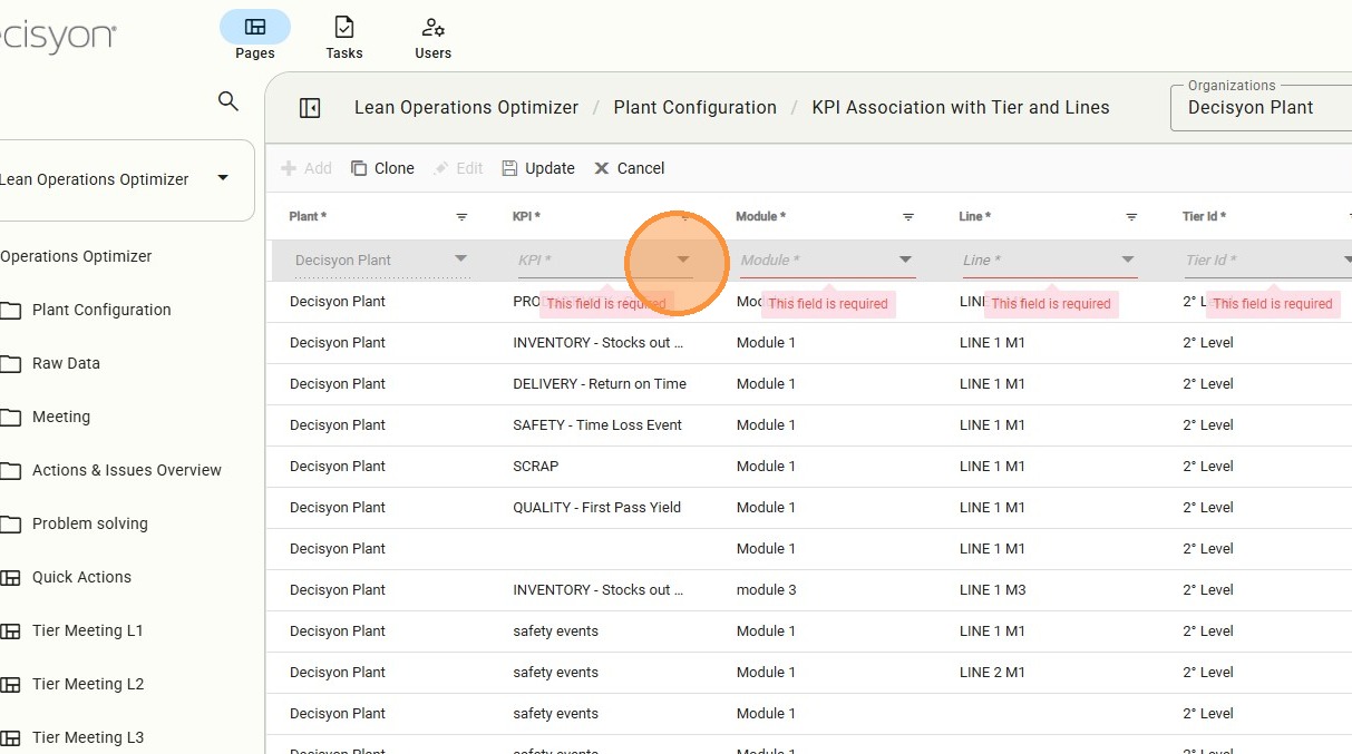 The KPI Association Tier page is critical for visibility. It defines exactly where a KPI will be monitored—associating it with a Module, Line, and Tier level to ensure it reaches the relevant personnel during daily stand-ups.
