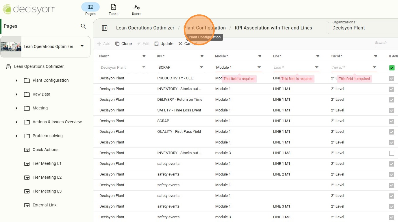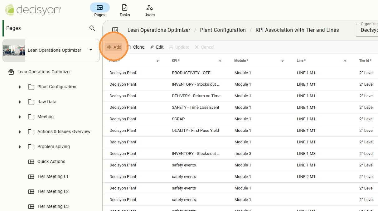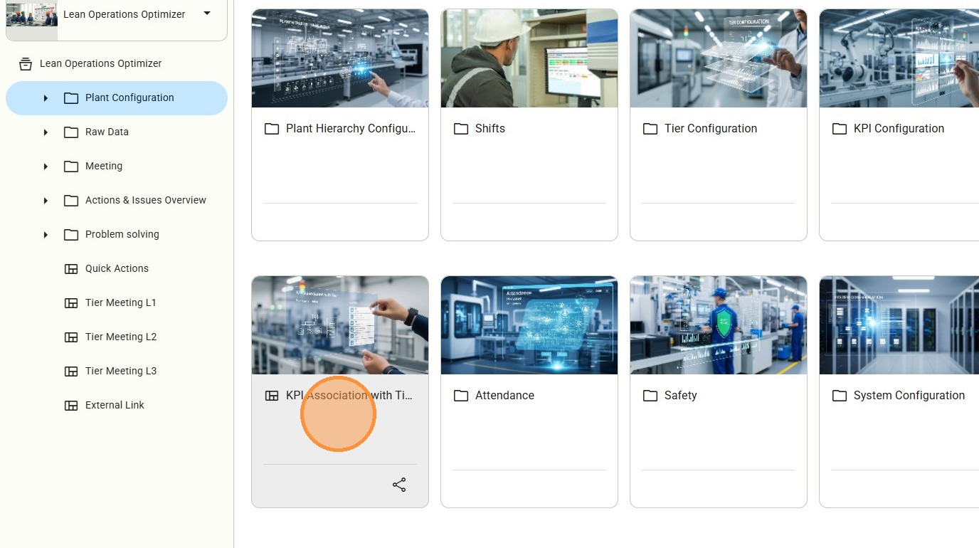 Access to KPI Association with Tier and Lines. This is a specialized module is where KPIs are "activated" for specific tiers. Without this association, a KPI exists in the database but will not appear in meeting agendas or line dashboards.